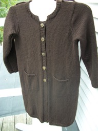 A mid weight wool swing coat shown in a deep brown and a purchased silk long scarf. A swing coat is wide at the bottom and decreased up to a fitted chest. I added shoulder tabs to help secure the scarf but easily worn with it. Set in sleeves, pockets and a bit longer at 36 1/2″. It swirls as you walk and adds a bit of flare where ever you wear it.